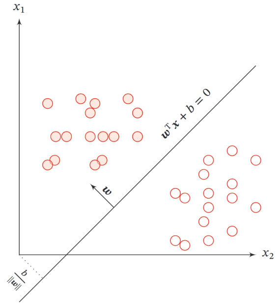 找一个平面把两类点分开,间隔最大。