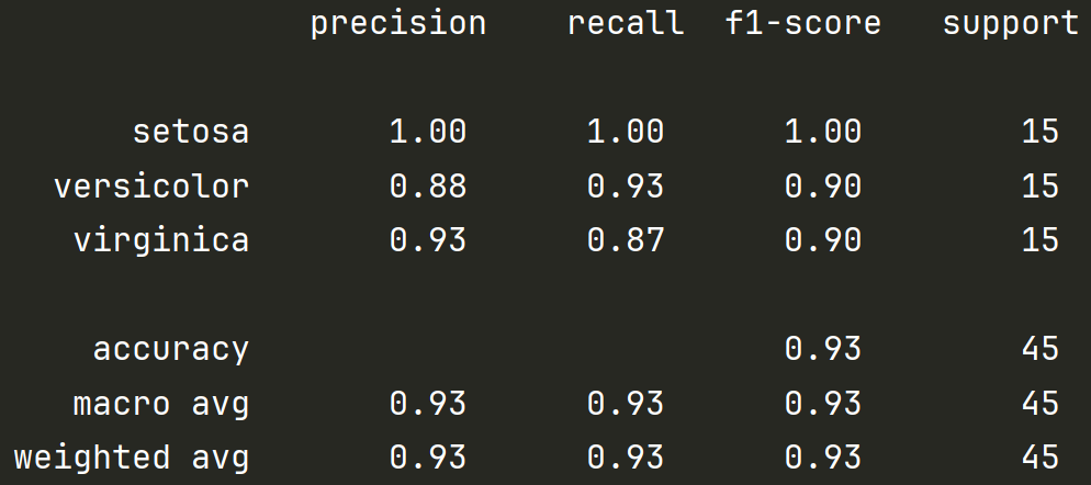 前三行是三个种类的花,分别预测的 精确率 / 召回率 / f1-score