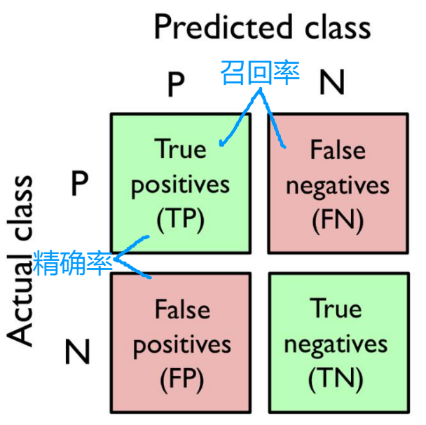 Precision 精确率(查准率) -- 预测P的,多少是真P;TP /(TP+FP)