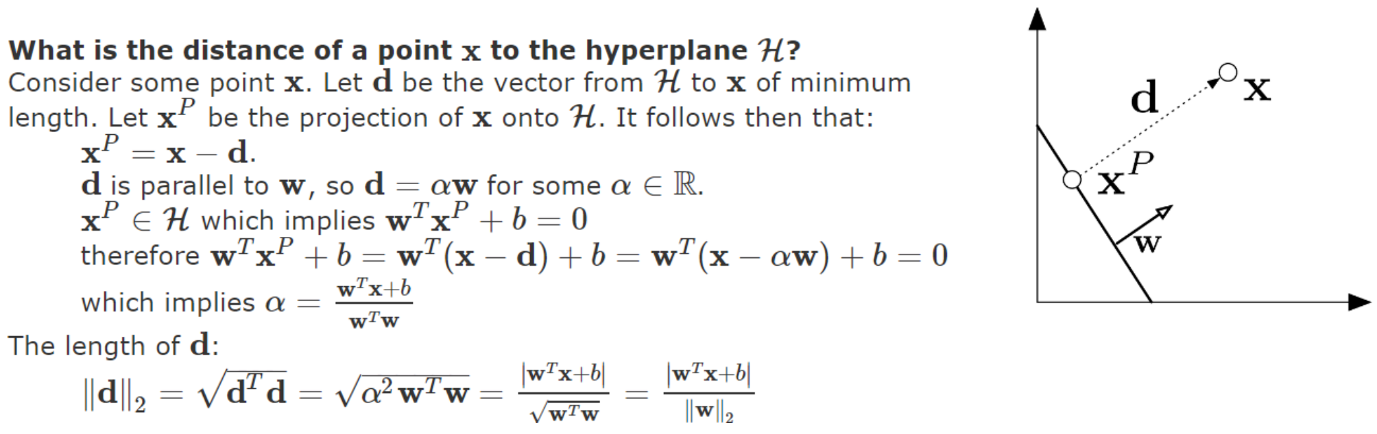 令距离为 d,找投影点。 w^T x + b = 0 对应垂直方向为 w。