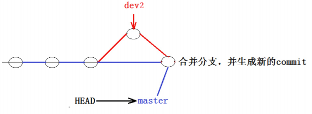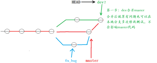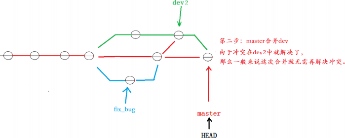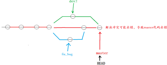 但是在将dev2合并到master时,可能会产生合并冲突,此时我们又需要去解决冲突,修改代码,在master分支上修改代码是有一定的风险的。