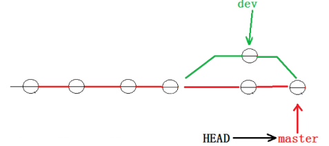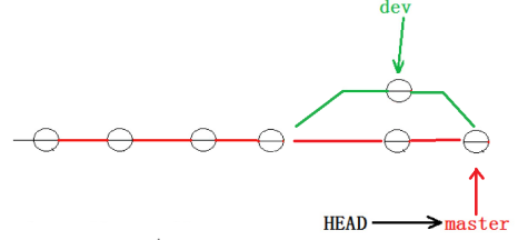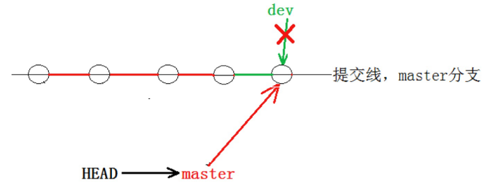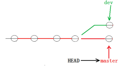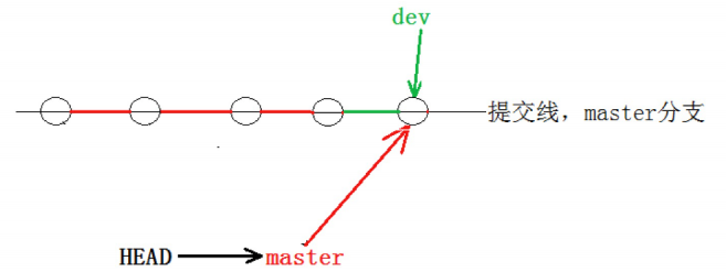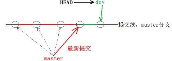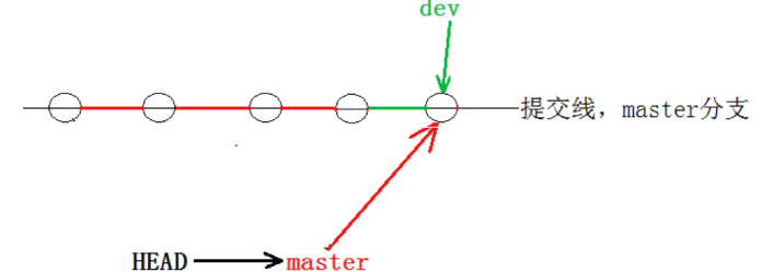 因为我们是在dev分支上提交的,而master分支此刻的提交点并没有变,此时的状态如图如下所示: