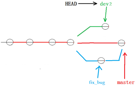 但我们注意到了,修复 bug 的内容,并没有在 dev2 上显示。此时的状态图为: