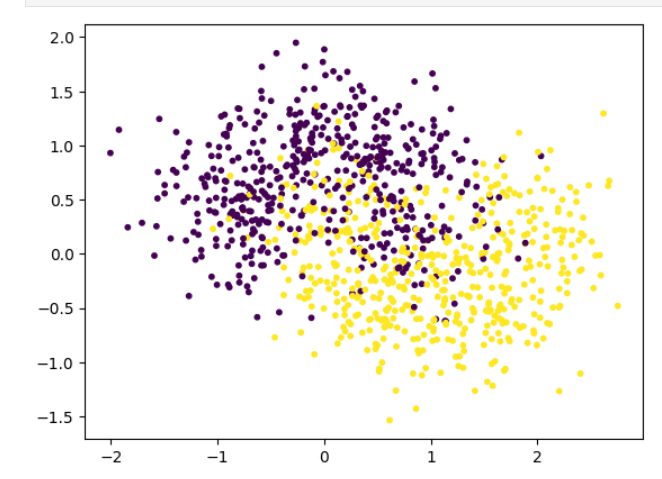 plt.scatter(x[:,0],x[:,1],c=y,s=10)