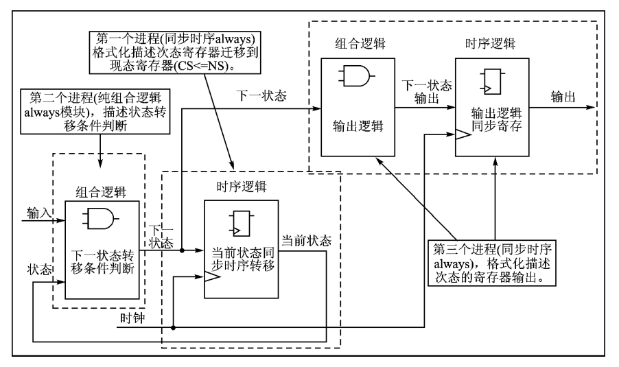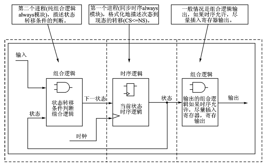 三段式状态机,其将状态的转移(时序逻辑always块)、新状态的生成(组合逻辑always块)、各状态应做的事情(时序逻辑always块)分别用三个always段表达。这里之所以用段而不是块,是因为各状态应该做的事情,可以按事情分always块,不用都写到同一个块中。