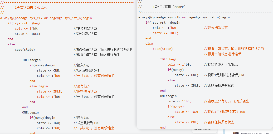 - 与一段式状态机不同,可乐的输出不会滞后一个时钟周期,这是因为采用了组合逻辑来描述输出;