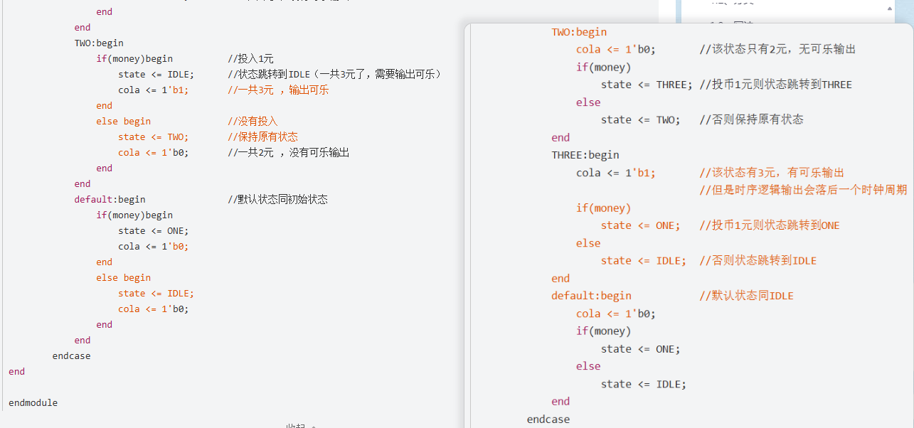 ONE: cola <= 1'b0; //无可乐输出(因为输入不管是0、1都是输出0,所以省略写法)