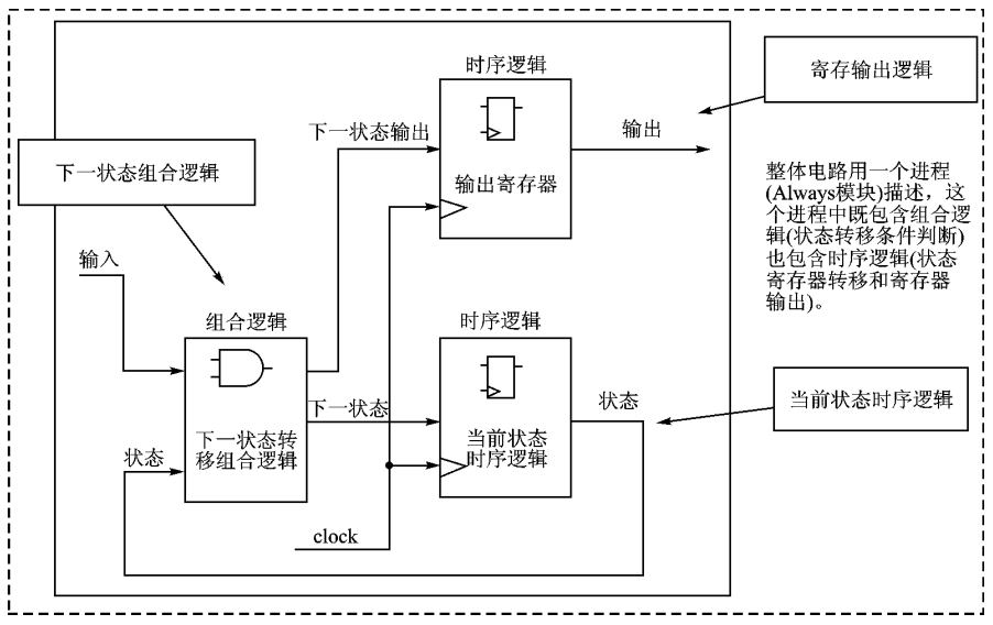 一段式状态机把所有的东西,状态的转移、新状态的生成、各状态应做的事情,都写在一个时序逻辑always块中。硬件实现上不利于综合和布局布线,工程方面不利于理解和维护,不建议使用一段式状态机。