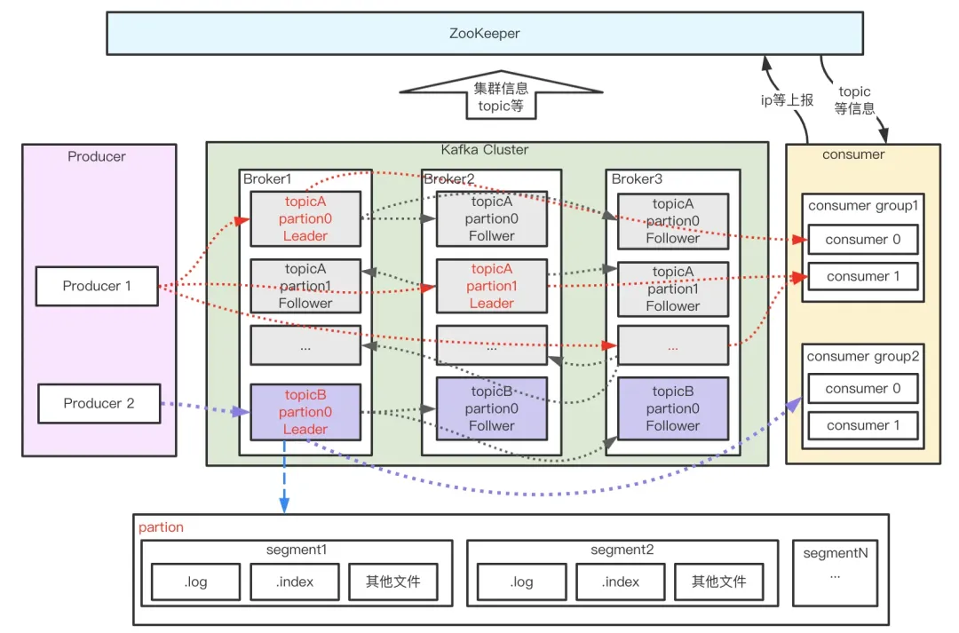 宏观上看,(一个partition对应一个日志)。由于生产者生产的消息会不断追加到log文件末尾,为防止log文件过大导致数据检索效率低下,kafka采取分段和索引机制,将每个partition分为多个segment,同时也便于消息的维护和清理。