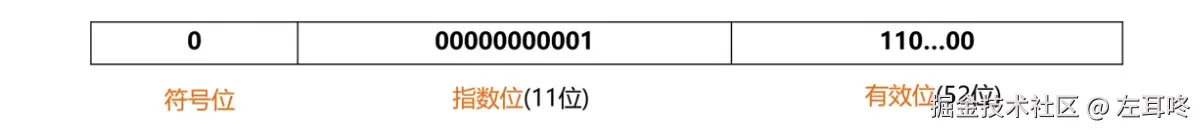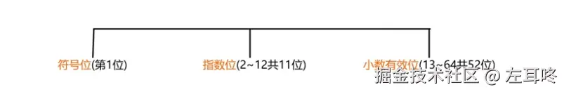 JavaScript 采用 IEEE 754 双精度标准,用 64 位存储一个数字,结构分为三部分: