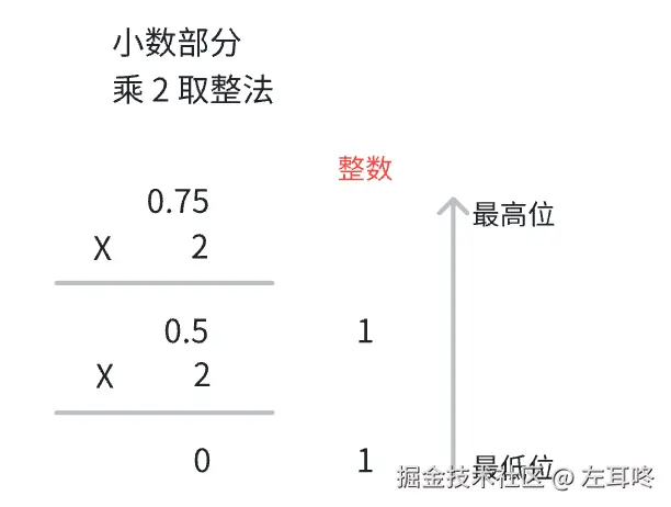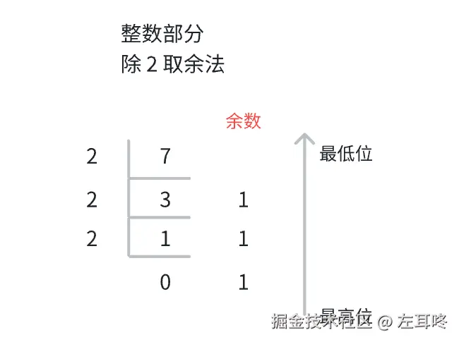 整数部分: 除 2 取余,直到商为 0。最先得到的余数是最低位,最后得到的余数是最高位。