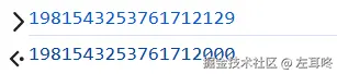 而输入的 1981543253761712129,该数字的二进制位数超过 53 位,尾数位(52 位 + 隐藏位 1 位)无法完整存储所有有效数字,JavaScript 会自动舍入,保留最接近的可表示值,导致末尾的 129 被舍去,使用偏移量补零为 000,最终结果为 1981543253761712000。
