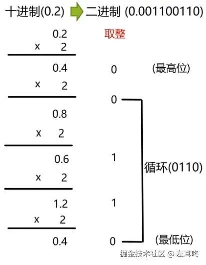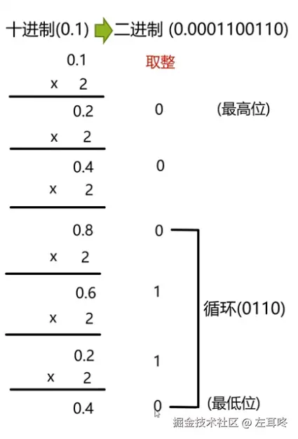 0.1 通过 乘2取整法 转化为 二进制过程中,存在着 无限循环小数