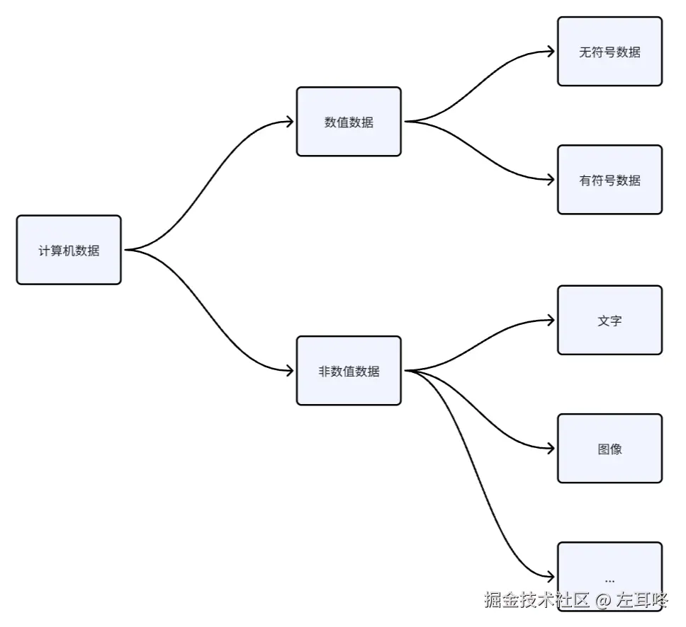 在计算机中,所有数据本质上都是由二进制(0 和 1)组成的。大体可以分为: