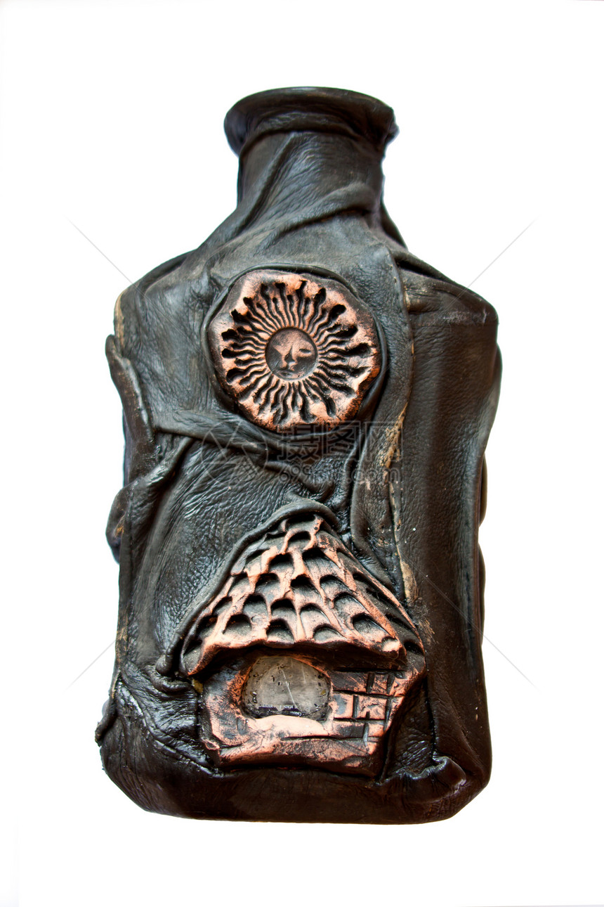 白底皮肤覆盖着皮的手工制瓶子房子太阳投手工艺海豹制品陶器花边大地色黏土 奇思妙想的酒瓶创意改造