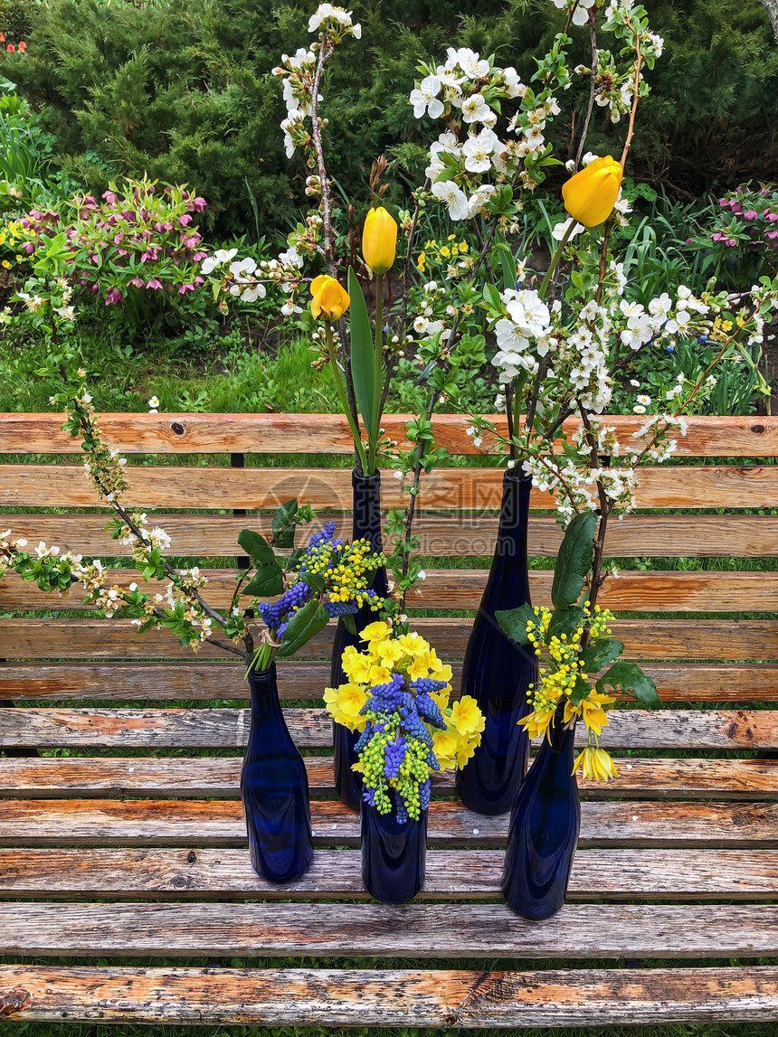 路过花园长椅时被狠狠戳中------五个深蓝色的玻璃酒瓶(瓶身像被揉皱的夜空蓝丝绒),居然成了春天的"收纳盒"!黄色郁金香举着小酒杯似的花头,白色洋牡丹在风里晃悠,紫色葡萄风信子像一串串迷你铃铛,还有圆滚滚的黄色雏菊躲在瓶底当"小彩蛋"。