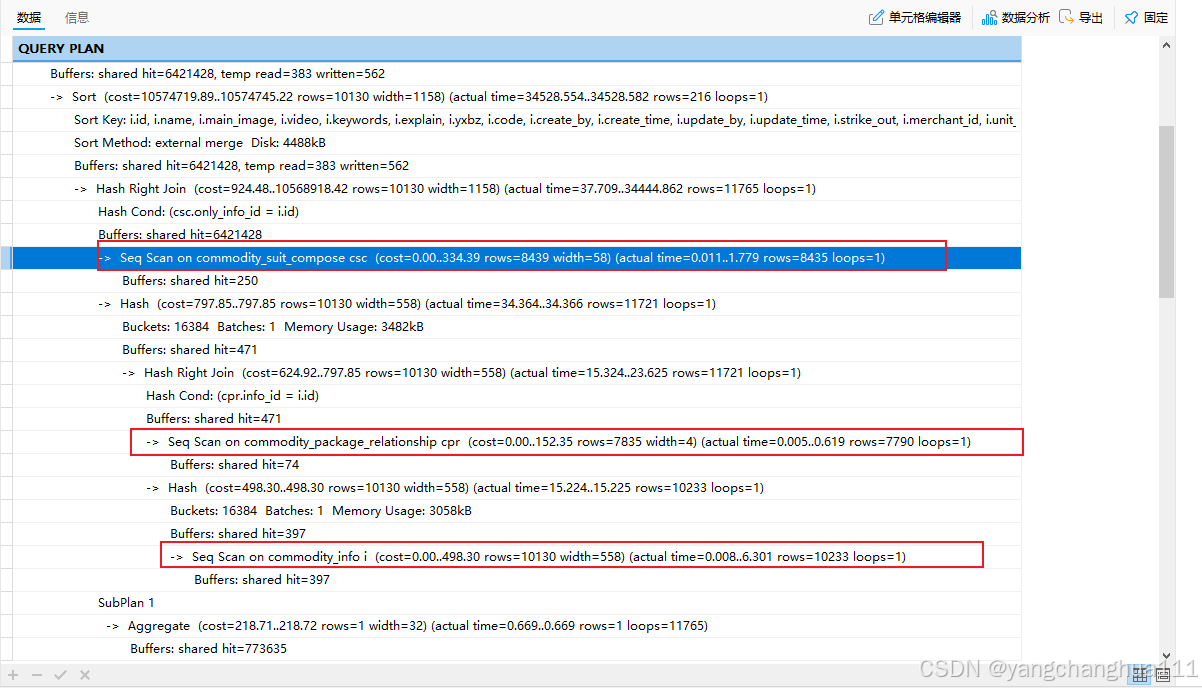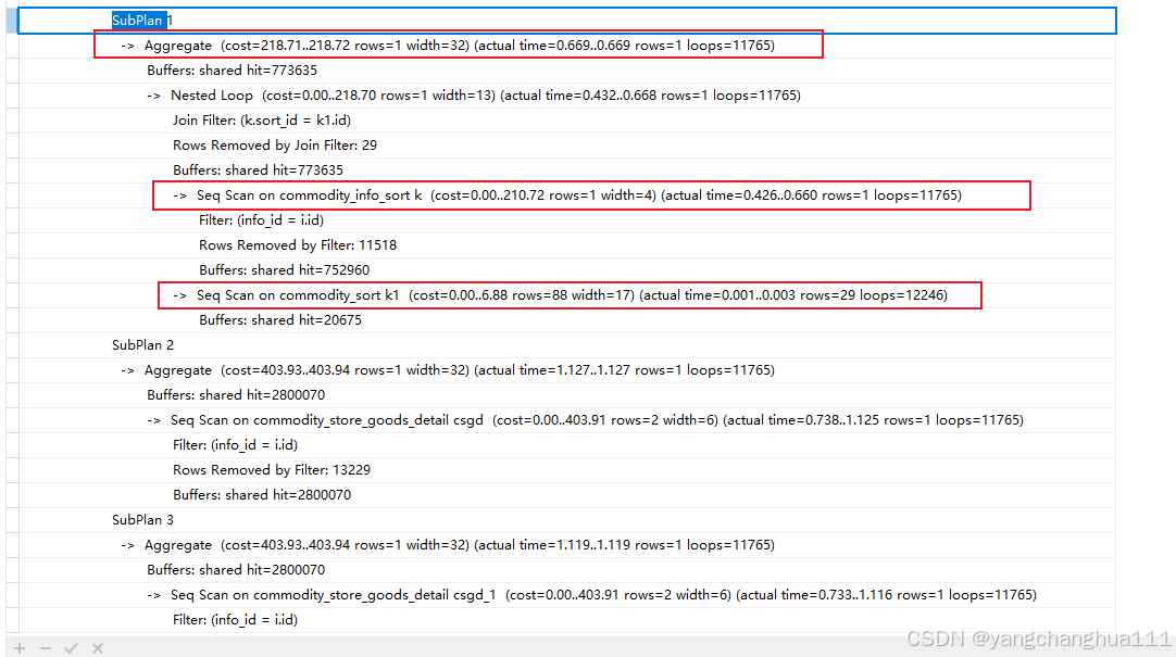 根据上图的执行计划可以看到这三张表都走了全表扫描,原以为问题就在这里了,但是一看消耗才这么一点,那肯定不是这个了,继续往下看,再看 相关子查询 SubPlan,不看不知道一看吓一跳