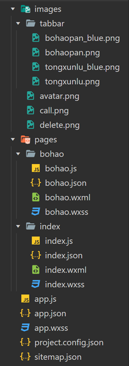 在app.json文件的pages属性中追加"pages/bohao/bohao",然后按快捷键Ctrl+S保存修改后会在pages文件夹下自动生成bohao目录以及里面的页面文件。计划index页面用于显示通讯录,bohao页面用于显示拨号盘。