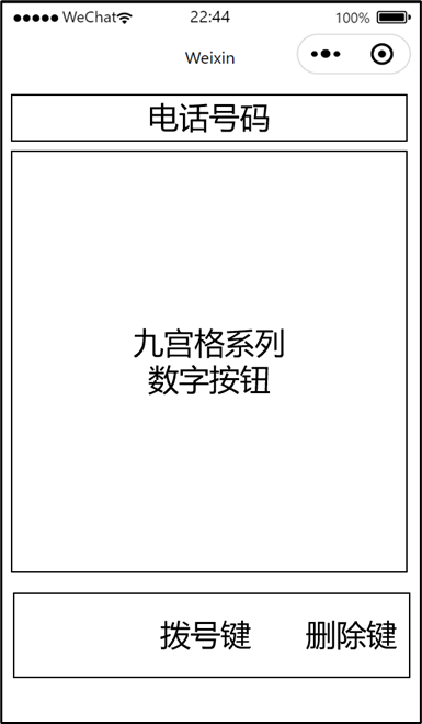 拨号盘页主要包含上、中、下三个部分:上方是电话号码显示区域、中间是拨号用的数字0-9以及*#符号按键区域、下方是拨号键和删除键区域。页面设计图如图3-31所示。