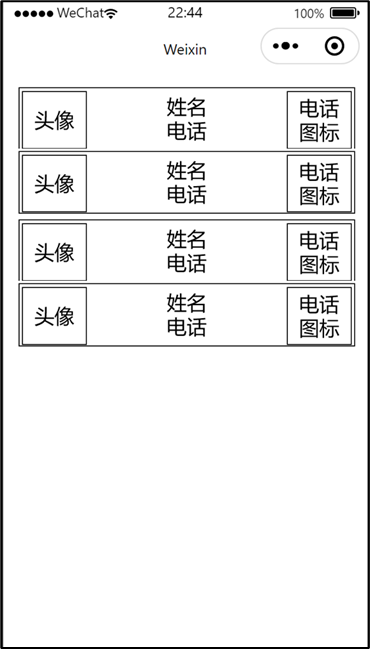 通讯录页即首页,主要包含一个垂直排列的多行列表结构,每一行里面又横向排列为左中右结构:左边是头像图标、中间是上下2行文字显示姓名和联系电话、右边是拨打电话的按钮。页面设计图如图3-28所示。