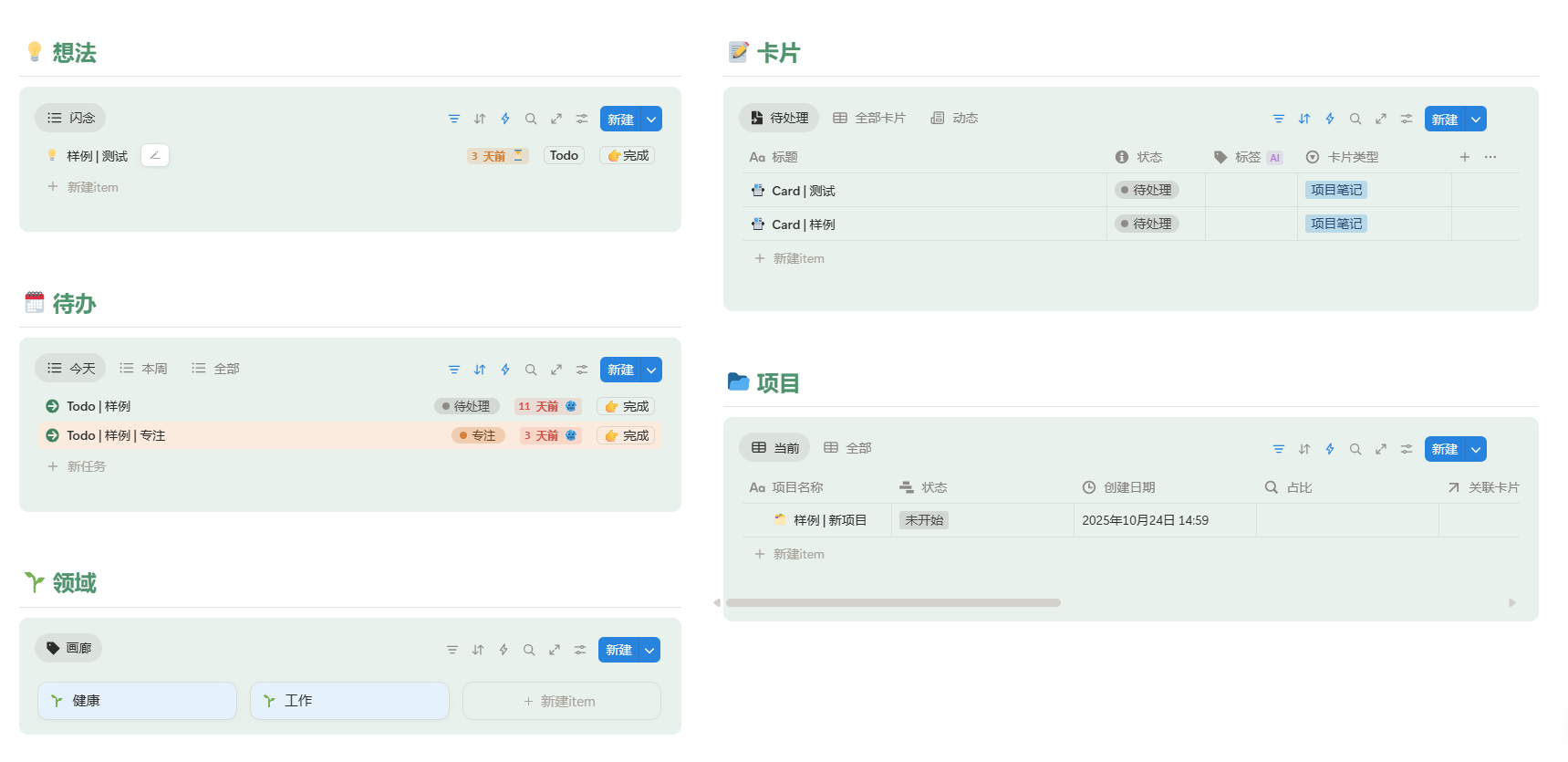 | 领域 Areas | "我需要长期维护哪些责任区?" | 健康、财务、代码质量、研究等 | 常驻;页面显示其项目、指标、习惯数据;季度/年度复盘 |