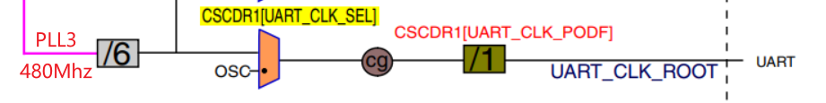 CCM_CSCDR寄存器UART_CLK_SEL位可以对UART的时钟源进行选择 0:PLL3经过6分频(前面设置的)后的80Mhz以及 1:OSC(24Mhz)时钟源