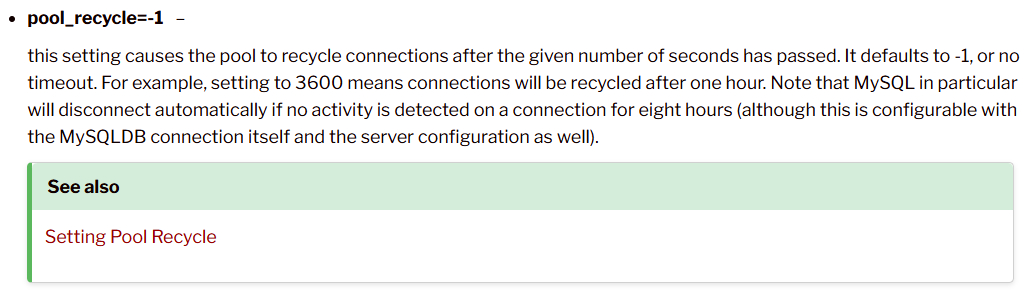 提到添加 {"pool_recycle":60} 可以缓解问题。查了下 pool_recycle 的参数定义:Engine Configuration --- SQLAlchemy 2.0 Documentation