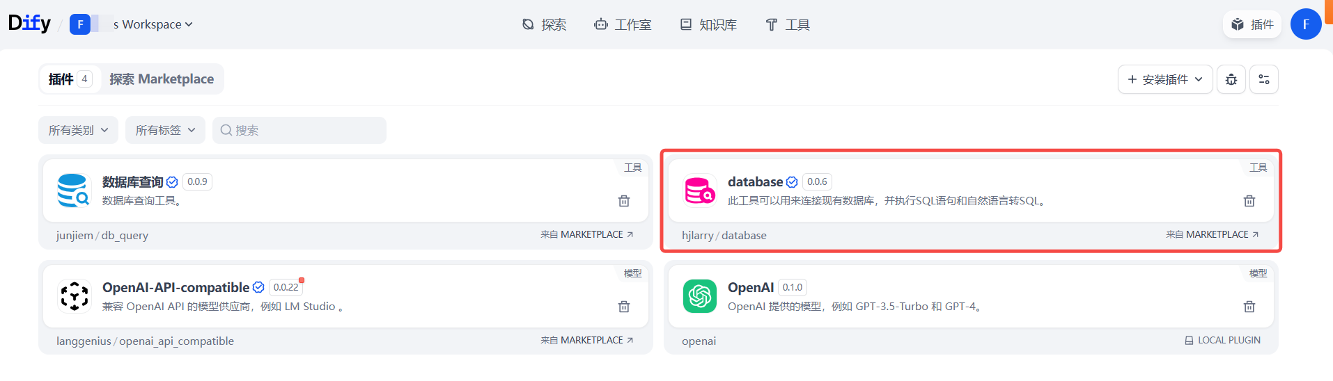 Dify 1.7.1 社区版中需要使用数据库插件,执行相关的数据库查询操作。使用的插件如下:database 0.0.6