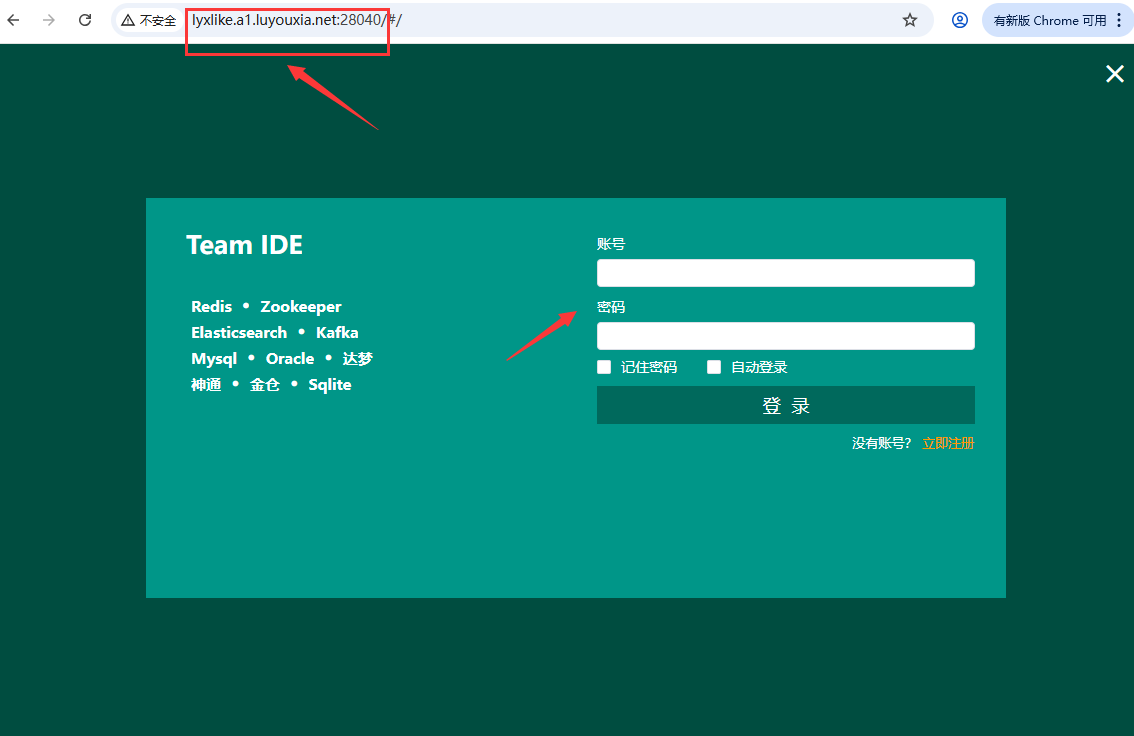 11,在外网电脑上,打开浏览器,在地址栏输入从路由侠生成的外网地址,就可以看到内网部署的 Team .IDE 界面了。
