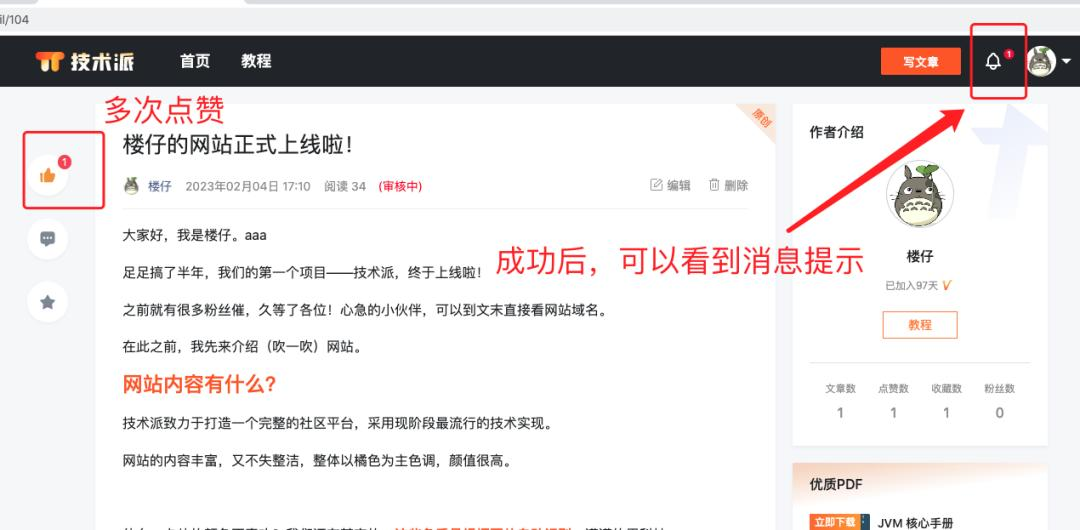我们是把技术派的"点赞"功能消息,通过 RabbitMQ 方式处理,我们多次点击"点赞"按钮,触发 RammitMQ 消息发送。