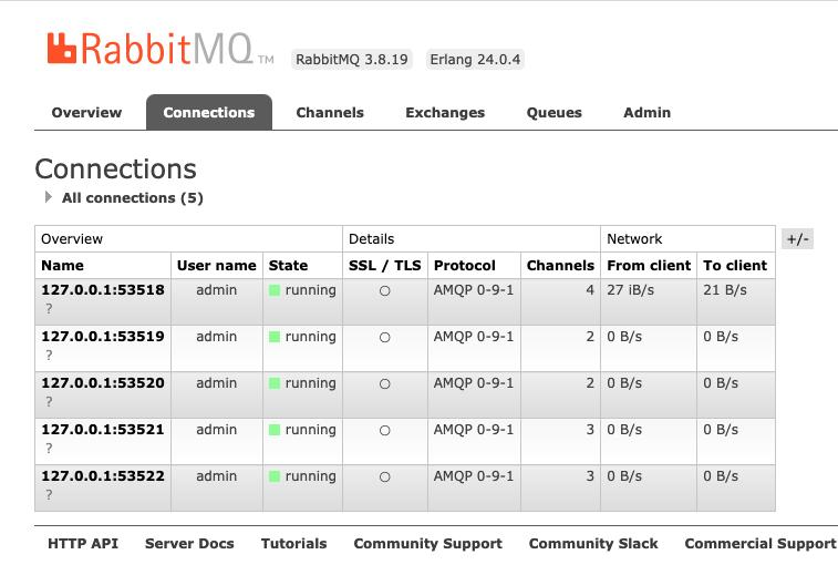 最后就是大家关心的连接池个数,打开 RabbitMQ 后台,发现永远只有 5 个连接,和我们的连接池大小一致,符合预期。