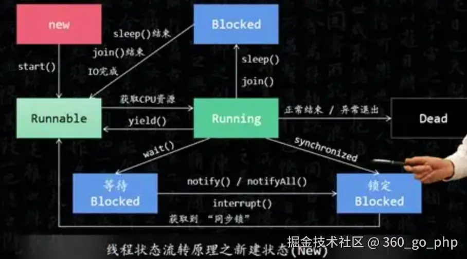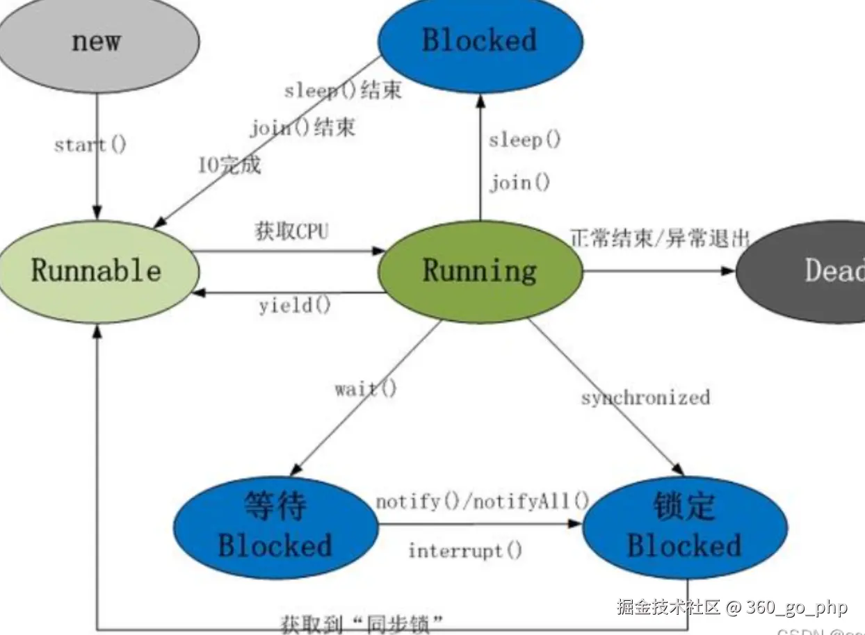 - 阻塞(Blocked):线程被阻塞,通常是因为等待获取锁。