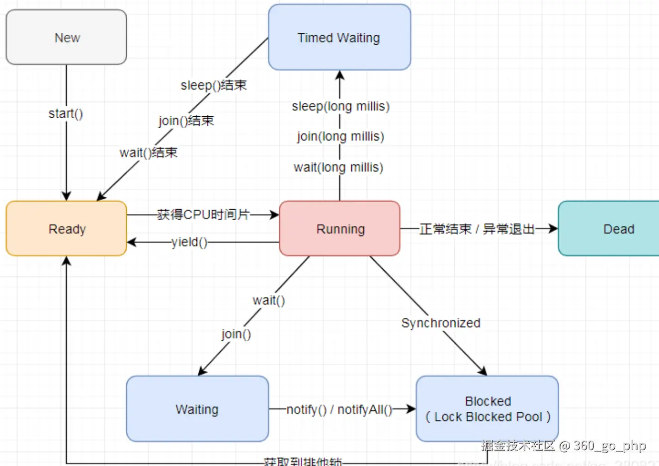 - 超时等待(Timed Waiting) :线程进入等待状态并设定了时间限制,比如Thread.sleep()或Thread.join(long millis)。