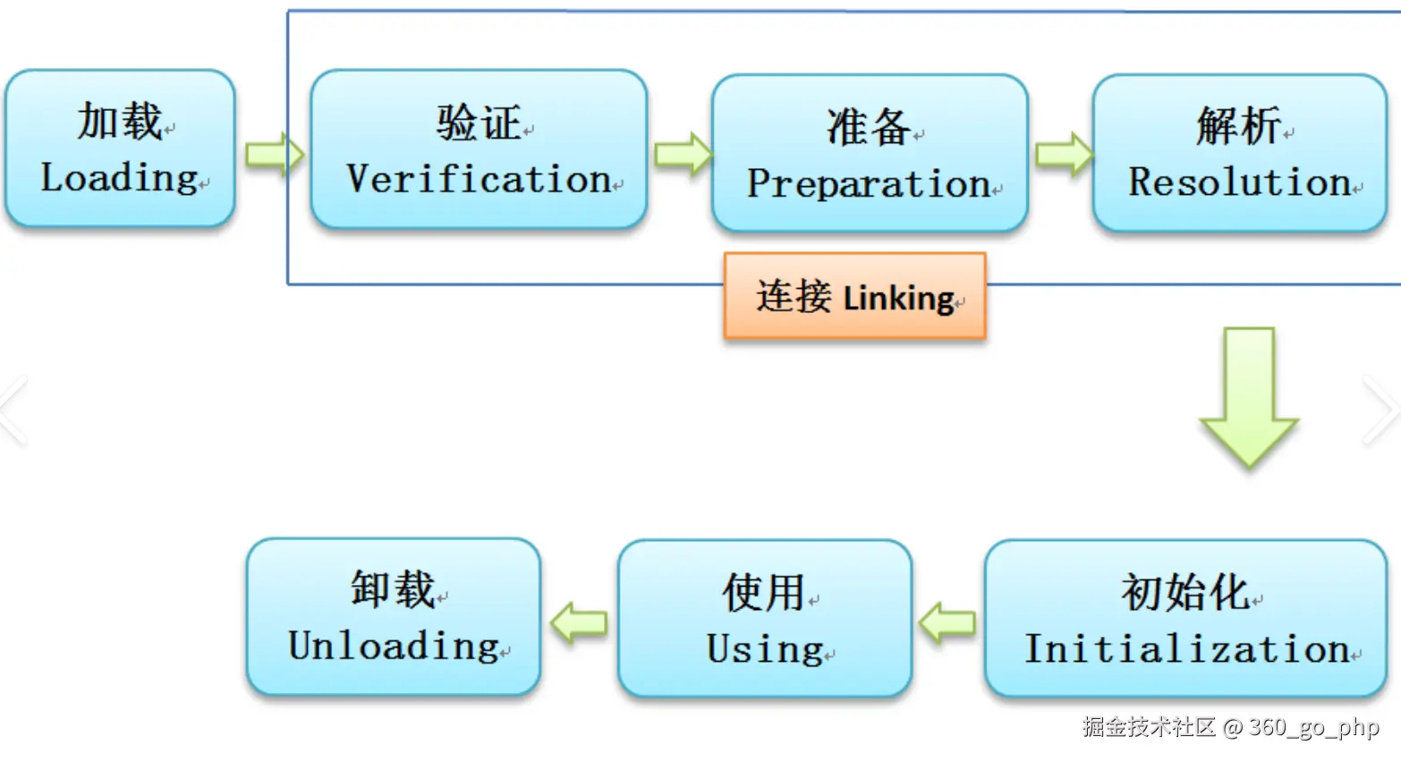 - 链接(Linking) :将字节码文件中的符号引用转换为直接引用。链接分为三个步骤: