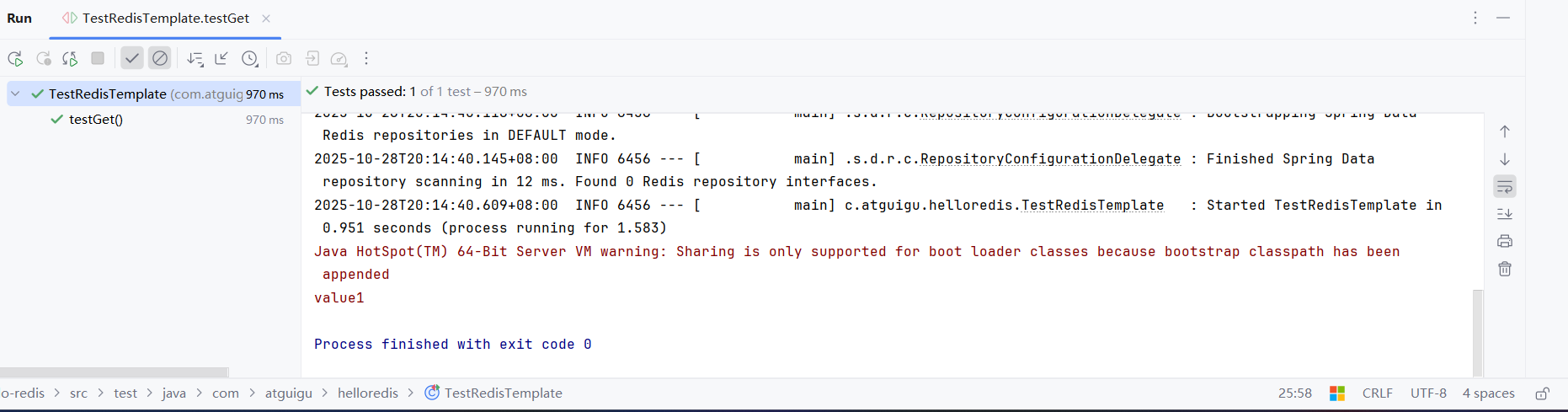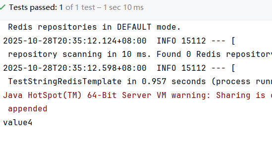 String result = (String)redisTemplate.opsForValue().get("key1");  //测试通过键获取值