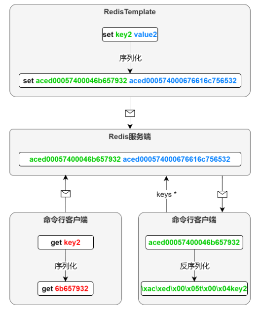 Redis中的key和value均是以二进制 的形式存储的,因此客户端输入的key和value都会经过序列化之后才发往Redis服务端。而RedisTemplate所使用序列化方式和命令行客户端采用序列化方式不相同,进而导致序列化之后的二进制数据不同,所以才会导致上述的现象。