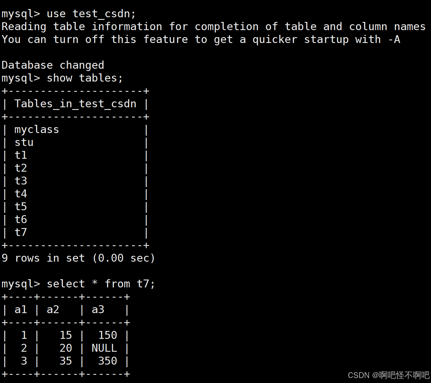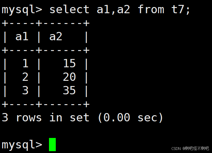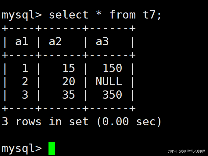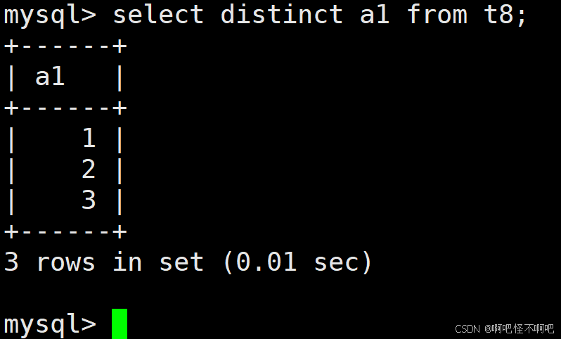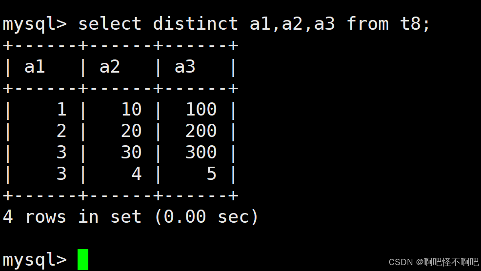 我们看下面这张图,当我们加入distinct后,那么多的哪一行就不见了。但是a1的那个3还是有两个,这是因为我们的distinct是要求被查询出来的结果全部一样的时候才会去重。