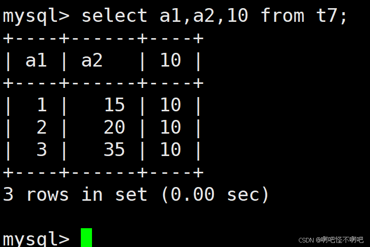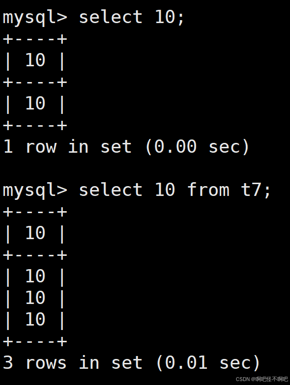SELECT 固定值 FROM 表名;说实话,我们不知道这个的作用是什么,在目前的我看来,感觉这个是没什么用的。