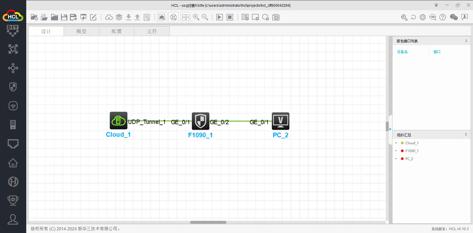 在 Cloud 组件中配置 UDP 隧道(隧道名称可自定义),具体设置为:本地端口 50000,远端主机 127.0.0.1,远端端口 3000。配置完成后,将 Cloud 的 UDP_Tunnel_1 接口与 F1090 防火墙的 G1/0/1 接口相连,以此替代 F1090 原与 "模拟 Internet" 设备的互联链路;其余设备则按组网拓扑的既定规划正常完成连接即可。