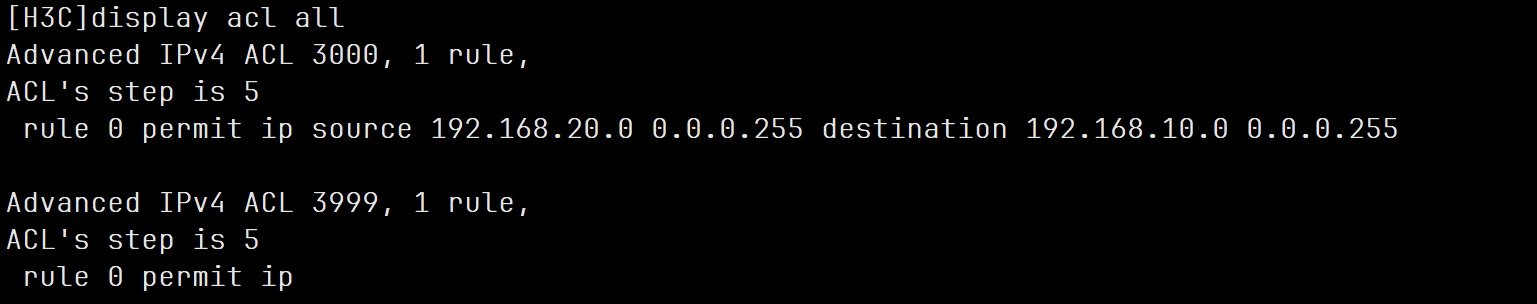 [USG6000V1-acl-adv-3000]rule permit ip source 192.168.10.0 0.0.0.255 destination 192.168.20.0 0.0.0.255