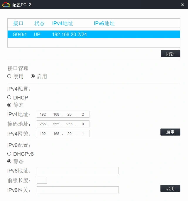 [H3C-GigabitEthernet1/0/2]ip address 192.168.20.1 24