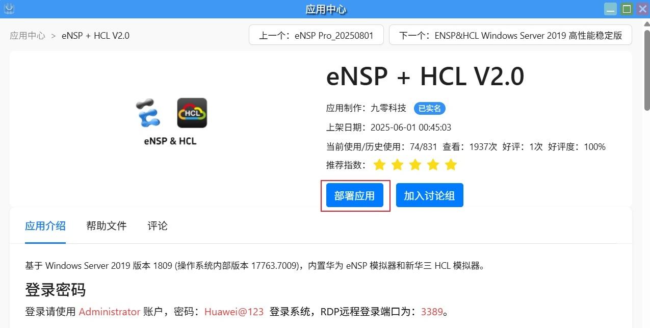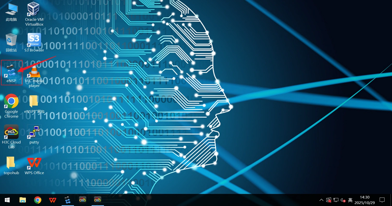 在 Hi168 云平台部署 eNSP + HCL 应用,打开 eNSP + HCL 应用,完成拓扑图搭建。