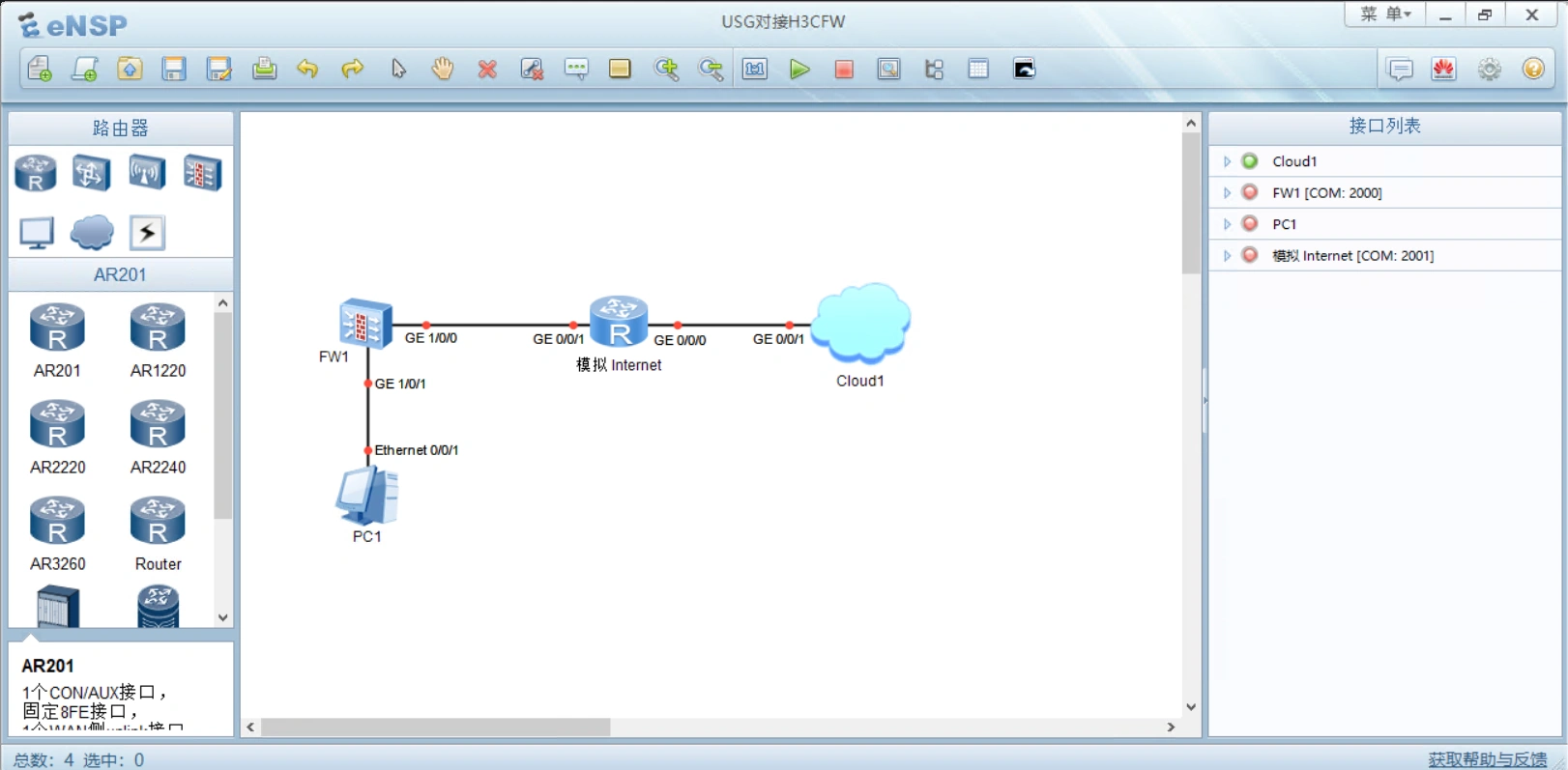 打开 eNSP 应用,在工作区拖入一台 USG6000V 防火墙、一台 AR 路由器(模拟 Internet)、一台 PC 终端设备以及一个 Cloud 云组件,搭建基础网络拓扑环境。