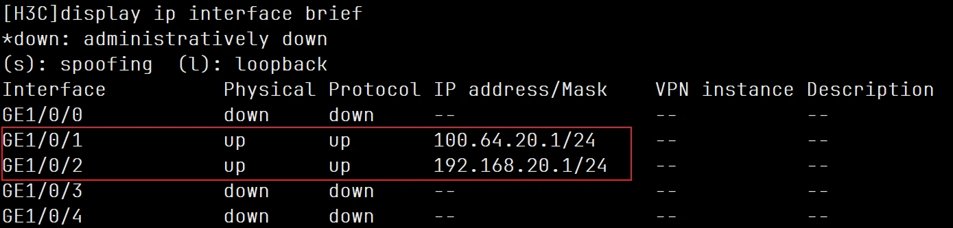 [H3C-GigabitEthernet1/0/1]ip address 100.64.20.1 24