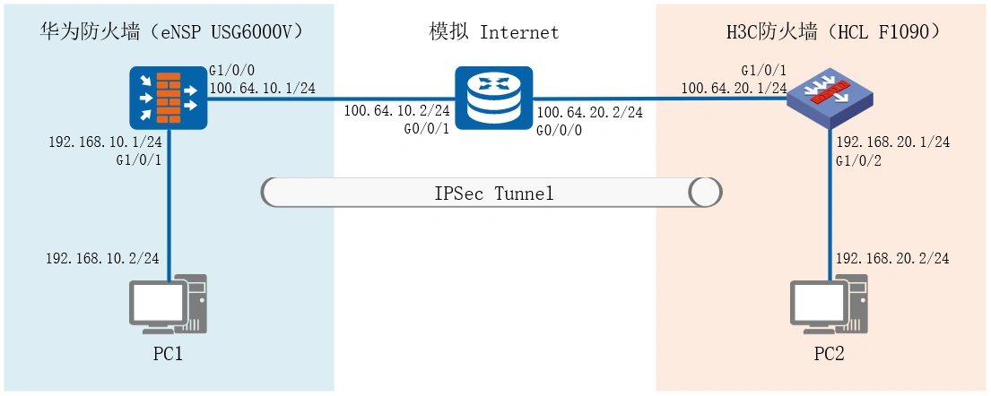 企业总部与分部分别以华为防火墙(eNSP USG6000V)、H3C 防火墙(HCL F1090)作为网关接入 Internet,现需在二者间搭建 IPSec 隧道,以实现 192.168.10.0/24(总部内网)与 192.168.20.0/24(分部内网)的安全互通。