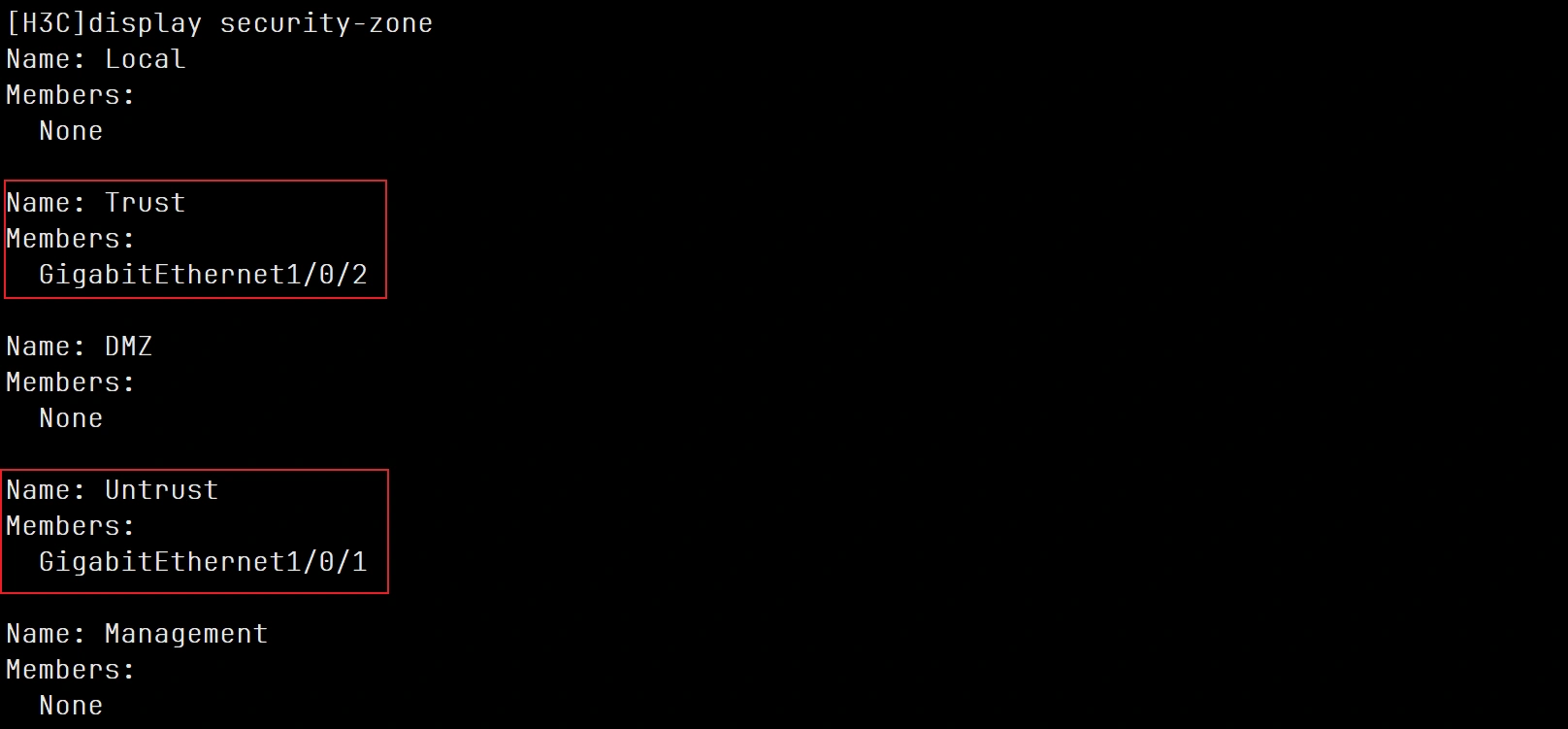 [H3C-security-zone-Untrust]import interface GigabitEthernet 1/0/1