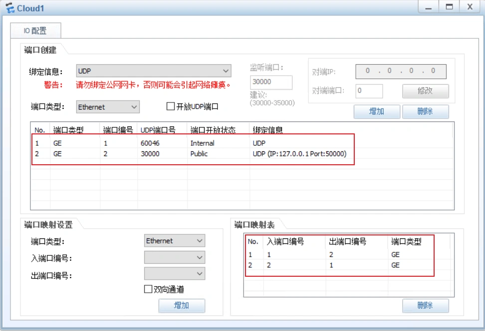 在 Cloud1 组件中配置两个接口:一个勾选"开放 UDP 端口",配置监听端口:30000,对端 IP:127.0.0.1 对端端口:50000,另一个不勾选"开放 UDP 端口,并建立这两个接口间的双向映射关系。完成后,将 Cloud1 的 GE 0/0/1 接口与 "模拟 Internet" 的 G0/0/0 接口相连,以此替代 H3C F1091 防火墙 G1/0/1 接口的连线;其余设备则按照组网拓扑的既定规划正常完成连接即可。