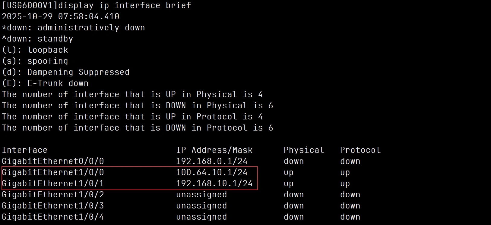 [USG6000V1-GigabitEthernet1/0/0]ip address 100.64.10.1 24