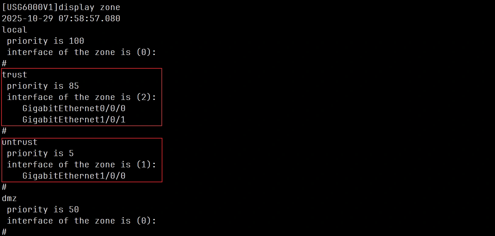 [USG6000V1-zone-untrust]add interface GigabitEthernet 1/0/0