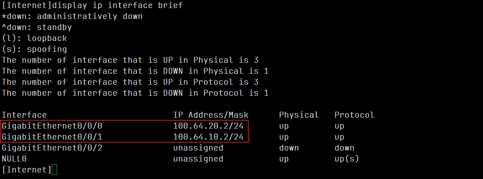 [Internet-GigabitEthernet0/0/1]ip address 100.64.10.2 24